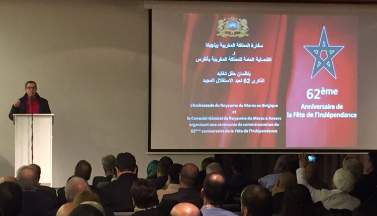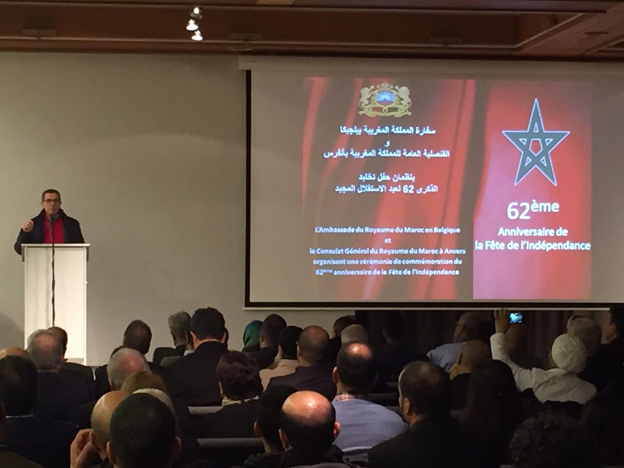 و إحتفاء بهذه الذكرى المجيدة و كعادتها،و بكثير من الفخر و الإعتزاز،خلدت سفارة المملكة المغربية ببلجيكا و ذوقية اللوكسمبورغ بتنسيق مع القنصلية العامة للمملكة المغربية بأنفرس،يوم السبت 18 نوفمبر 2017،الذكرى الثانية و الستين لإستقلال بلدنا،و ذلك بإحتفال بهيج بقاعة المؤتمرات أنتويرب إكسبو بمدينة أنفرس،حيث عرفت حضور كل من السادة محمد عامر سفير المملكة المغربية ببلجيكا و ذوقية اللوكسمبورغ،سليم الحجومري قنصل المملكة المغربية بأنفرس،عبد الرحمان فياض قنصل المملكة المغربية ببروكسيل،و مجموعة مهمة من الشخصيات التي تنتمي لمجالات و ميادين متعددة.
