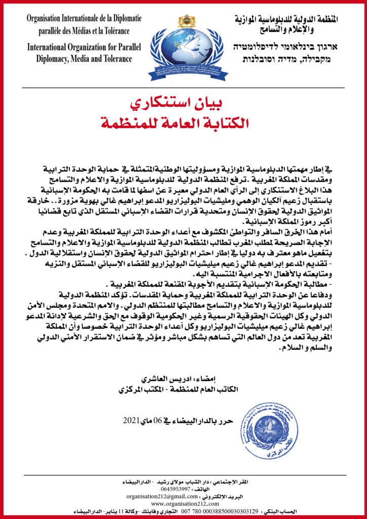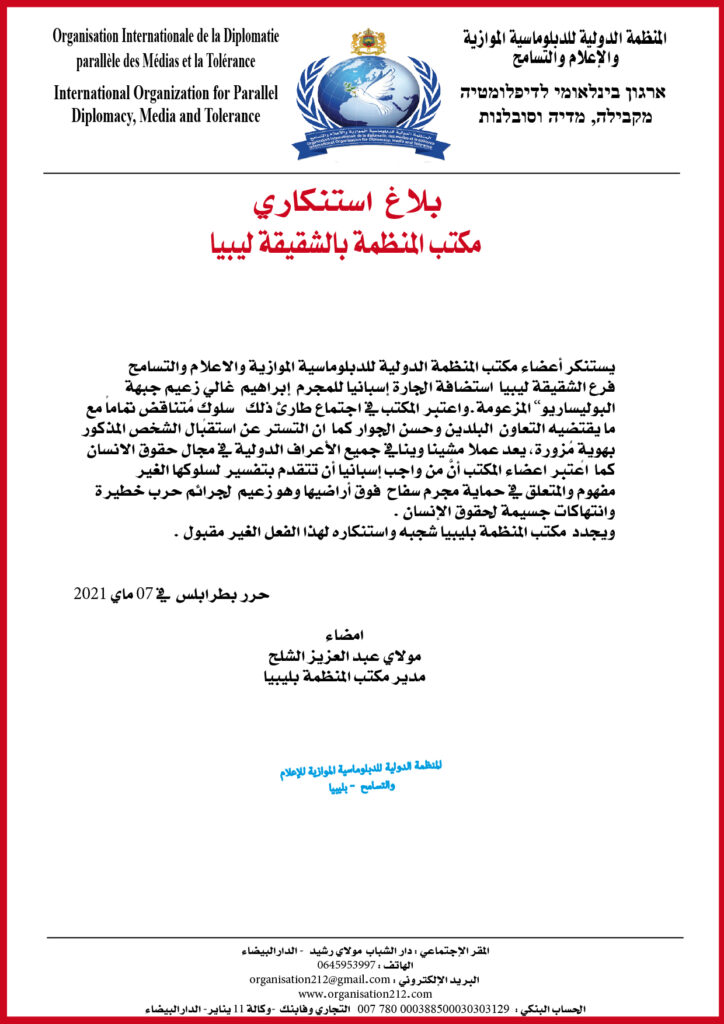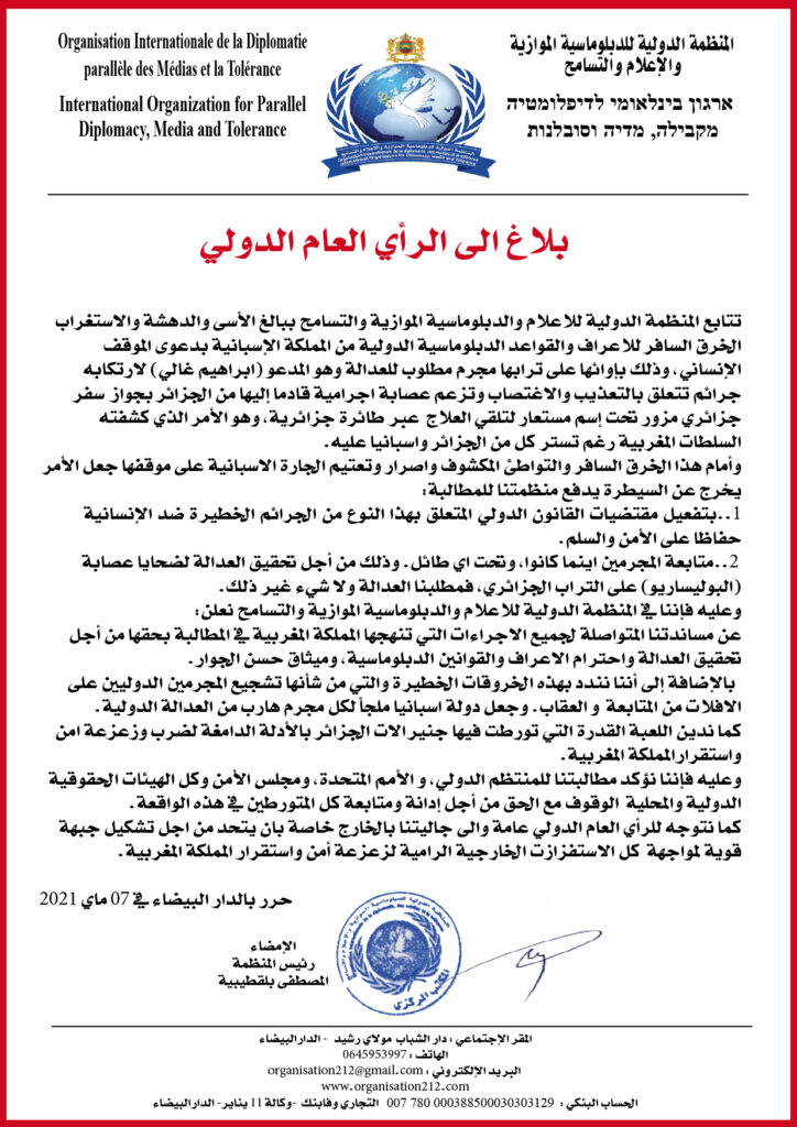 تتابع المنظمة الدولية للاعلام والدبلوماسية الموازية والتسامح ببالغ الأسى والدهشة والاستغراب الخرق السافر للاعراف والقواعد الدبلوماسية الدولية من المملكة الإسبانية بدعوى الموقف الإنساني، وذلك بإيوائها على ترابها مجرم مطلوب للعدالة وهو المدعو (ابراهيم غالي) لارتكابه جرائم تتعلق بالتعذيب والاغتصاب وتزعم عصابة اجرامية قادما إليها من الجزائر بجواز سفر جزائري مزور تحت إسم مستعار لتلقي العلاج عبر طائرة جزائرية، وهو الأمر الذي كشفته السلطات المغربية رغم تستر كل من الجزائر واسبانيا عليه.