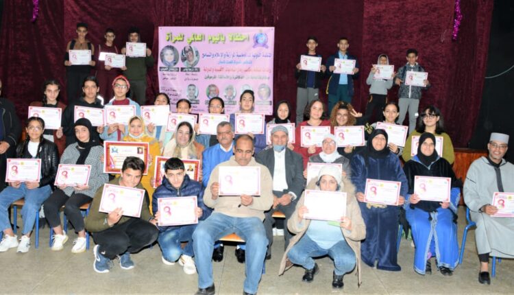 – مداخلة الأستاذة حنان العيسي أستاذة جامعة القاضي عياض حيث تحدثت عن إنجازات المرأة المغربية في الميادين الاجتماعية و الفكرية و السياسية و استجلاء أدوارها الريادية منذ ما قبل الاستعمار و مرورا بالاستعمار و مشاركتها في المقاومة الوطنية إلى العصر الحالي الذي يشهد إدماجها في التنمية المجتمعية و صنع القرار في كافة المجالات. إن إنجاز ات المرأة المغربية واضحة وضوح الشمس و الباحث أو الباحثة في خبايا التاريخ سيألف أن المرأة حكمت المغرب قبل الاستعمار و ساهمت في تحريره و استقلاله من الاستعمار و مازالت تناضل من أجل تحقيق عدالة اجتماعية بين الجنسين و ذلك كله من أجل بلوغ الهدف المنشود و هو مجتمع مغربي متطور تتكامل فيه الأدوار بين الجنسين. لذلك فمزال النضال متواصلا لتجاوز عدد من الإكراهات القانونية و الحقوقية مثل إشكالات التمييز و العنف الأسري و الاجتماعي و العقليات التقليدية التي تكرس تهميش المرأة. لهذا يبقى وضع لبنة مشروع النهوض بالعنصر النسوي مسؤولية مشتركة بين جميع الفعاليات المجتمعية. كما ثمنت المجهودات الجبارة التي تبدلها المرأة الأستاذة والمرأة الإدارية في تطوير منظومة التربية والتكوين. وتم التركيز بالمناسبة على النتائج الممتازة التي تحققها التلميذة والطالبة اللواتي أصبحن يتبوأن المراتب الأولى بكل جدارة واستحقاق.