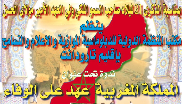 بمناسبة الذكرى الواحدة والعشرين لميلاد صاحب السمو الملكي ولي العهد الأمير مولاي الحسن، وهي مناسبة سعيدة تحتفل بها كل مكونات الشعب المغربي، للتأكيد على تمسك الأمة بمبدأ الوفاء للعرش العلوي المجيد، وتعبر من خلالها عن مشاطرة الأسرة الملكية الشريفة أفراحها ومسراتها نظمت المنظمة الدولية للدبلوماسية الموازية والاعلام والتسامح مكتب إقليم تارودانت يوم السبت 18 ماي 2024. ندوة تحت عنوان “ المملكة المغربية عهد على الوفاء” بمشاركة نخبة من الخبراء والباحثين والمثقفين الأستاذة نعيمة شعيب محامية بهيئة الدارالبيضاء فاعلة جمعوية وحقوقية.: الفاعل الجمعوي السيد سعيد الشرقاوي رئيس مكتب إقليم تارودانت -.. الإعلامي الأستاذ المصطفى بلقطيبية رئيس المنظمة. -.. الأستاذ سعيد لكراين باحث في السياسة الشرعية وإمارة المؤمنين. الأستاذ ادريس العاشري صحافي خبير متخصص في الإقتصاد ومحلل اقتصادي وسياسي. -.. الدكتور عماد الهواري رجل أعمال وسفير السلام بالمنظمة و تهدف هذه الندوة الى ابراز أهمية الدولة العلوية في رعاية الأمن و اشاعة روح التسامح و التعايش للانسانية جمعاء. كما تهدف أيضا الى مشاركة مؤسسات دينية و أكاديمية و علمية و فعاليات المجتمع المدني في مسيرة التسامح التي ترعاها أمارة المؤمنين للملوك الثلاثة محمد الخامس والحسن الثاني ومحمد السادس كما تهدف الى تسليط الضوء على أصالة النموذج المغربي كأرض للسلم و السلام و التسامح و التعايش. وإمارة المؤمنين في المغرب ينطلق مفهومها من الاعتقاد الراسخ ان الاسلام دين ودولة وان له نظاما سياسيا يتميز به، ثم ان هناك بيعة والتي تشكل الميثاق والصلة التي تربط بين الحاكم والمحكوم الحقيقي وليس الافتراضي..